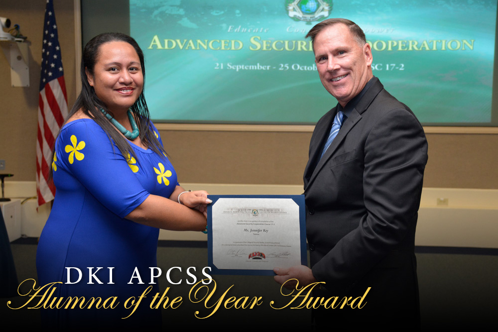 Ms. Jennifer Key (Samoa), ASC17-2, Assistant CEO of the Policy Division at the Ministry of the Prime Minister and Cabinet, has been named as the DKI APCSS Alumna of the Year Award 2018! The Center receives many nominations each year. She helped draft Samoa’s first National Security Policy. Jennifer was chosen for this award based on the significance of her achievement and for the impact of this project, not only for Samoa, but also for the positive influence it had on other Oceania countries intent on creating their own national security policy. Jennifer attended the five-week Advanced Security Cooperation Course at APCSS in 2017. Fellows attending the course are required to identify a project that they can advance while at APCSS, a project that builds individual, institutional or national/regional capacity and/or advances security cooperation. During the course, with the help of her classmates and with the advice of faculty members, she developed a plan for drafting Samoa’s National Security Policy. While Jennifer initiated this project, she confirmed that its implementation was a team effort. We are so very grateful and proud of Jennifer for putting into practice that which she learned at DKI APCSS, and for taking action to help build Samoa’s security capacity with this significant national policy document. Her achievement serves as a model, not only for other countries striving to develop similar policies, but it also stands as an outstanding example for all of our alumni.