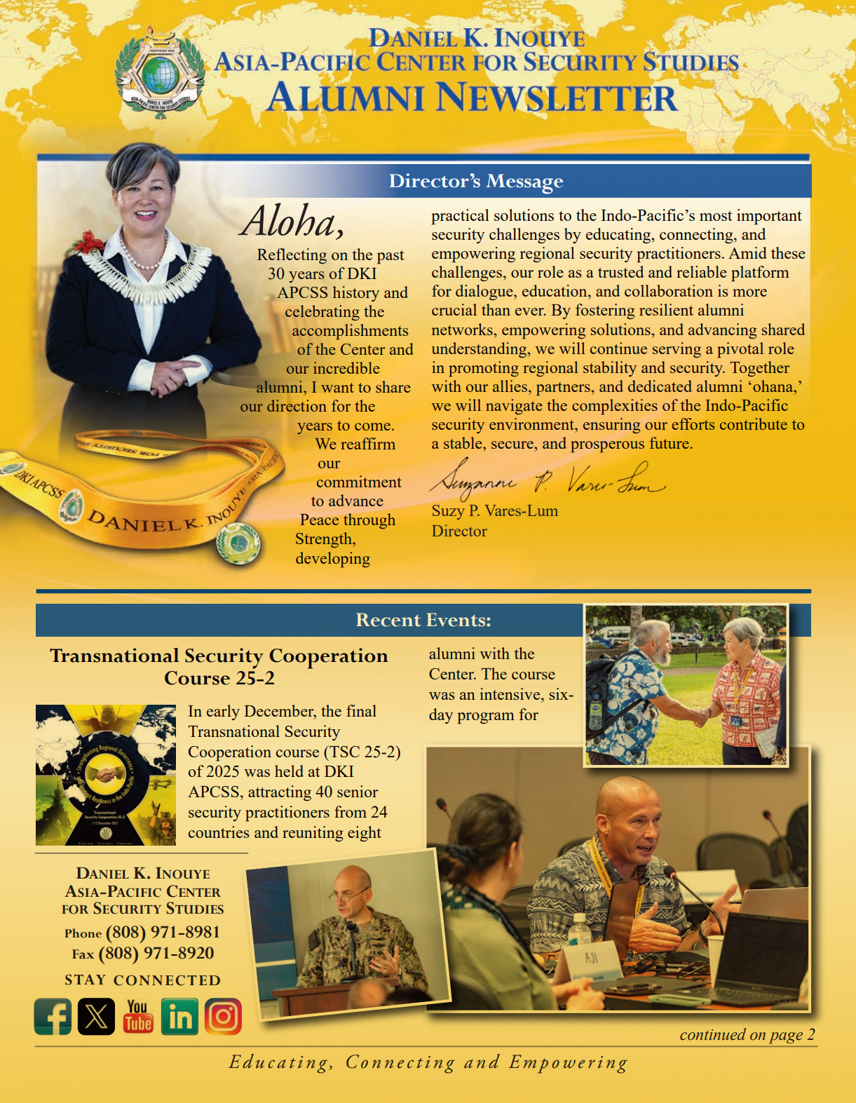 The Alumni Program provides a forum for former graduates and faculty to maintain contact with the Center and with each other. We maintain a data base of all graduates and former faculty members to help you stay connected with the Center and each other. Additionally, we provide information on the whereabouts of our alumni to our Center Director and Deputy Director so they may meet with you socially during their travels throughout the Asia-Pacific region.